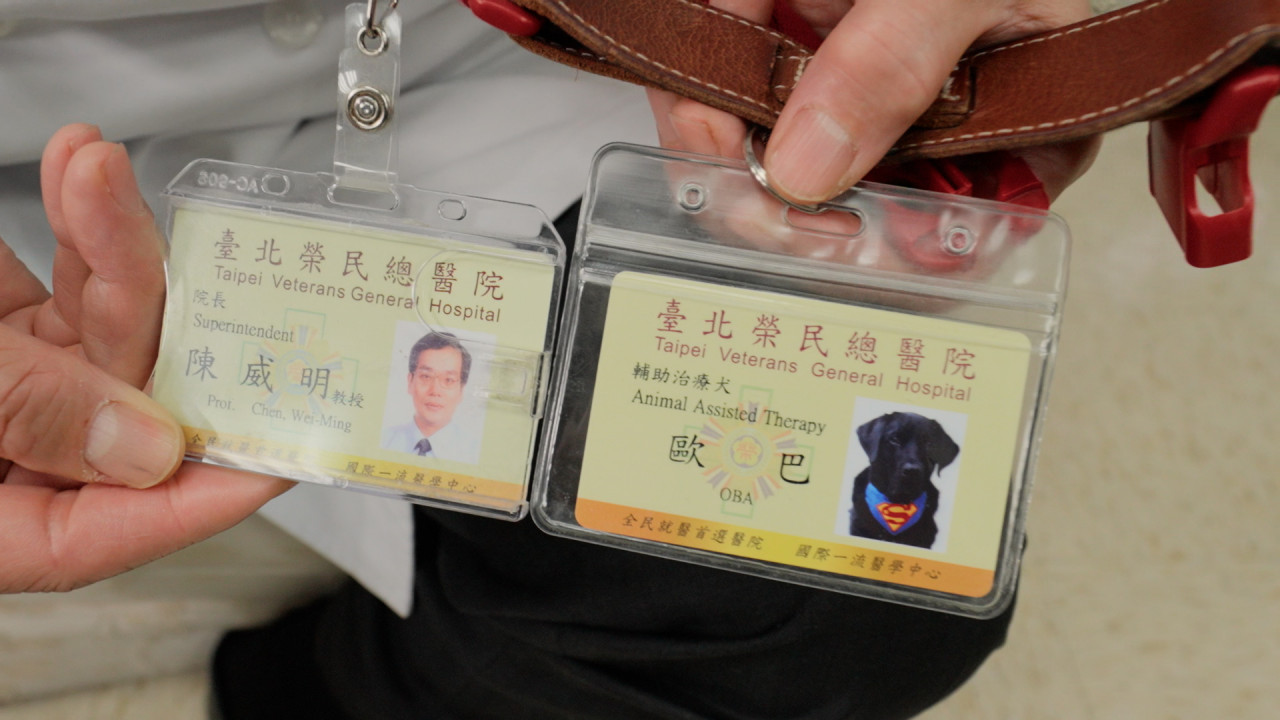 Oba 的出現,讓北榮的醫療場域多了一層人味與希望的光亮。為了讓大家更加認同 Oba 的角色,陳威明院長特別親自頒發了「員工證」給牠,不僅與醫師、護理 師等人員使用的證件一模一樣,還擁有專屬的照片與職稱。
