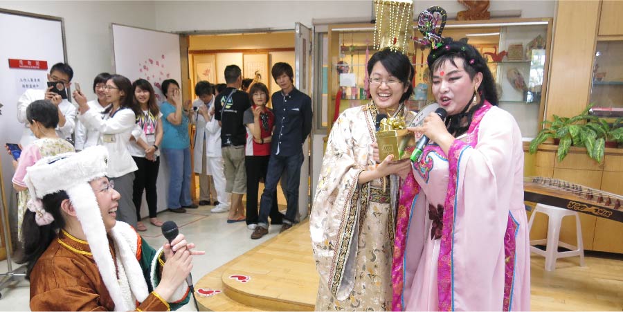 在大德團隊裡應著不同的需求,轉換著各種不同的角色,除了因為服務病人及家屬所累積的專業,最有趣的是為了讓病人及家屬有年節氣氛而舉辦的慶祝活動裡擔任主持人,與病家同歡而發現的這項潛能,讓我有了新奇的體驗。在活動當中,病人與我的互動過程,看到病人因此露出了久違的笑容,得以暫時脫離病痛的苦,能與病人及家屬一起「苦中作樂」,讓所有的努力都值得。