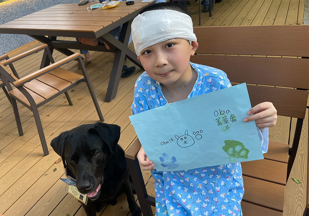 宥丞從小就喜歡狗,家裡也曾經養過狗,但隨著手術住院的次數越來越多,一住往往就是一、兩個月,再次擁有一隻狗狗朋友成了宥丞遙不可及的願望,因此當媽媽透過「導盲犬駐點計畫」得知北榮有輔助犬時,A184病房劉護理長便詢問教育師曉菁是否可以帶著Oba幫宥丞加油打氣,第一次見到Oba宥丞興奮極了!一直好奇的問「為什麼醫院有狗狗?為什麼這麼大的狗狗這麼乖!」一邊不停的摸著Oba,餵Oba吃零食,Oba也很乖聽著指令做動作,「你好好吃飯,我讓Oba送你進手術室好嗎?」教育師曉菁這樣對宥丞說之後,宥丞終於重新打起精神,也順利地完成手術。